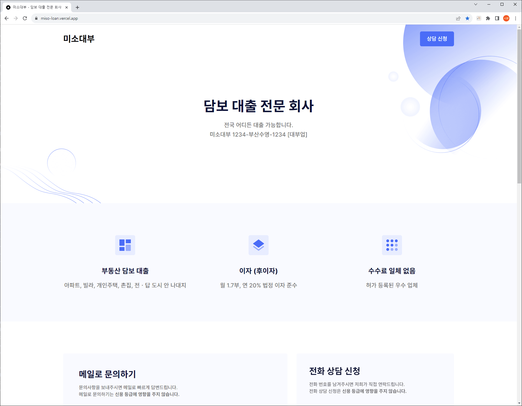 대출 회사의 단순한 홈페이지로서 이메일 문의, 전화 상담 신청, 네이버 지도 등의 기능들을 포함하고 있습니다.