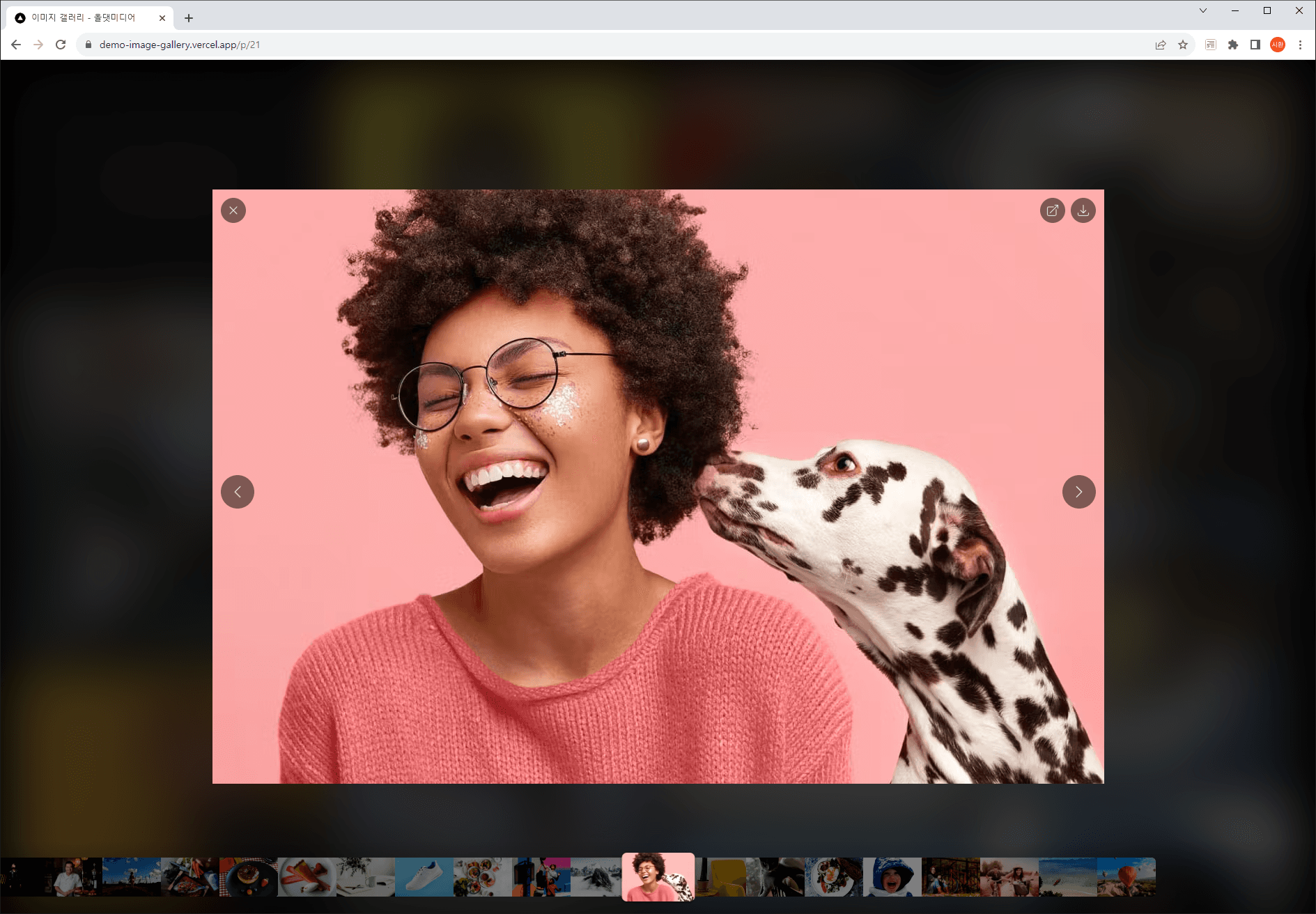 이미지 클릭 시 아래와 같이 팝업으로 해당 이미지를 볼 수 있으며 이때 좌우측 화살표 버튼 또는 하단의 이미지 리스트를 클릭하여 원하는 이미지를 빠르게 볼 수 있습니다.
